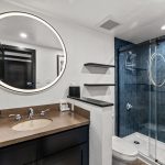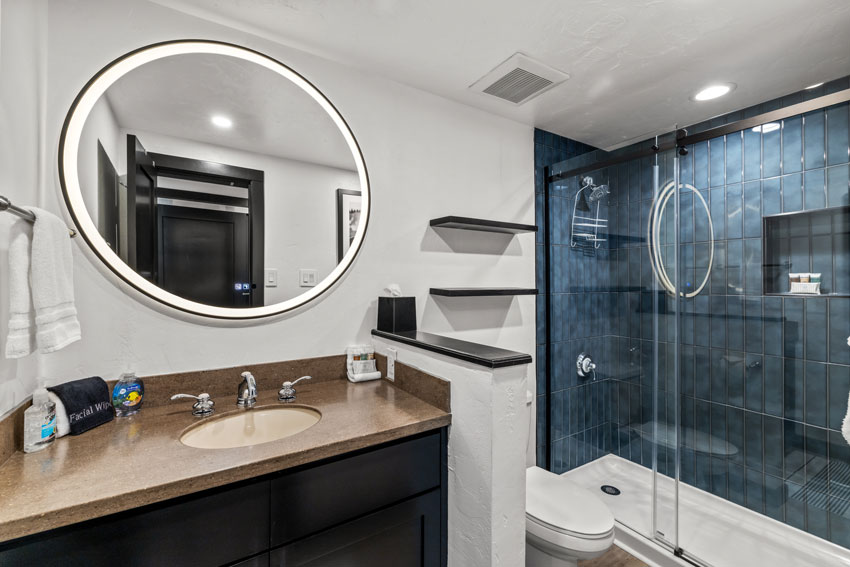 - Full size bathroom with single sink, toilet, walk-in shower